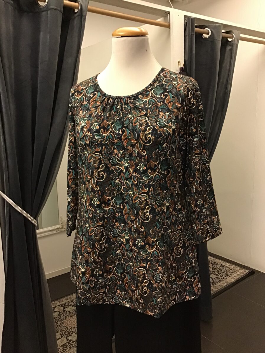 Fin topp från Arimi, a-formad, rund hals med några veck fram, trekvartsärmar, fint mönster i petrol/ rost/ svart/ offwhite, 96% viskos 4% elastan