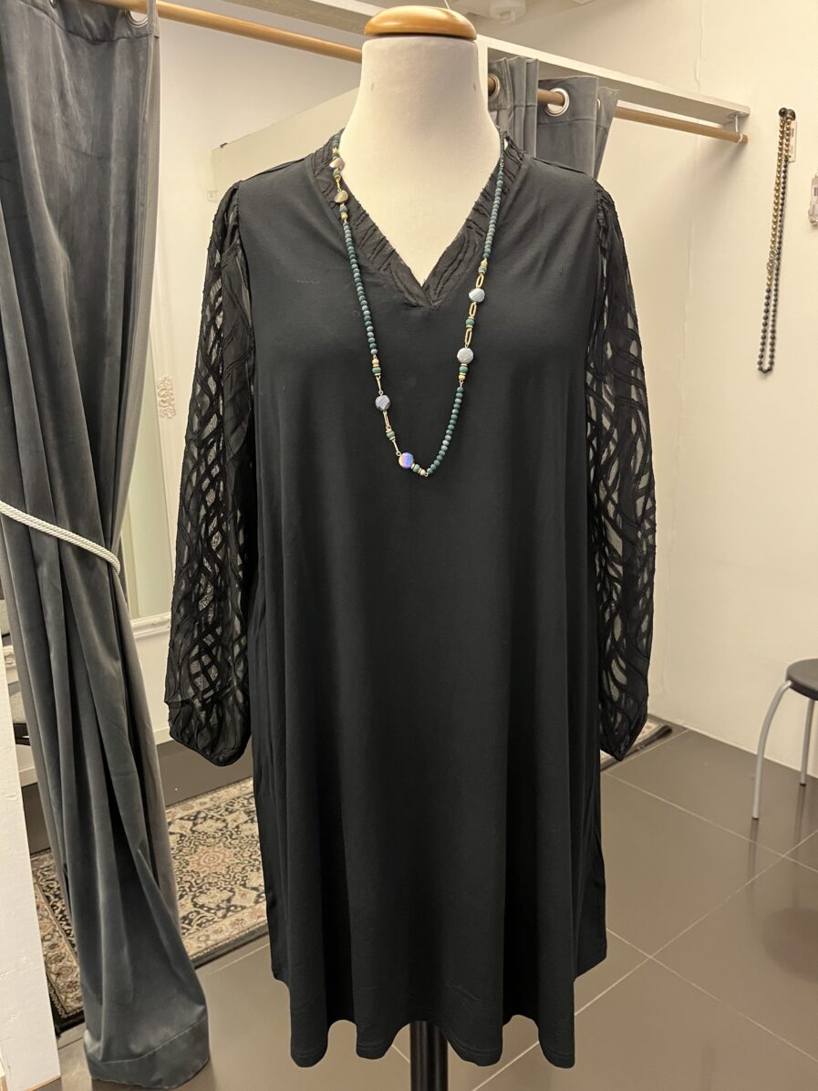 Svart klänning, passar även som tunika , med ett par smala byxor till. V-ringad med en spetskant runtom. Ärmarna är vida och skira. Övrig klänning är svart trikå. A-formad. Svart. 95% viskos 5% elastan