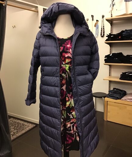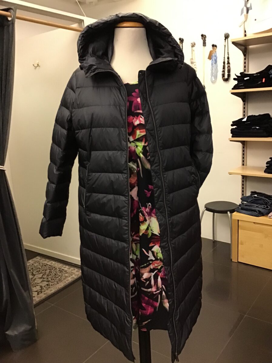 En lättdun kappa från Finska Joutsen, har haft dom i flera år, så härliga. Ha den rak eller dra åt i midjan, fickor på sidorna, luvan sitter fast. Knappar längst ner på båda sidorna, bra om man kör bil eller sitter på bussen. Tvätta själv i 30 grader. 100% dun. Lätt och skön på. Svart.