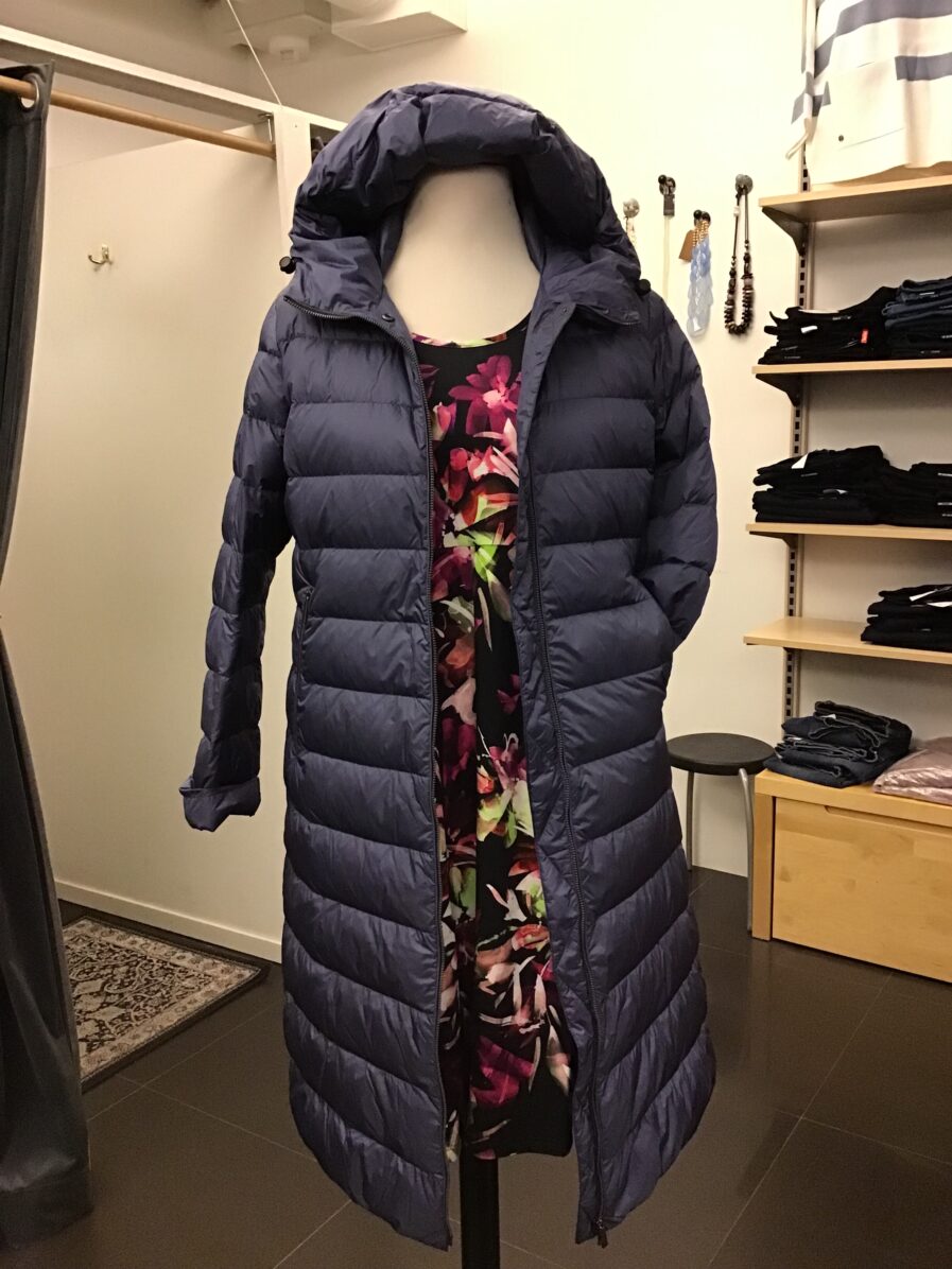 Underbara Joutsen, lättdun kappa Hanne, ha den rak eller dra åt i midjan. Luvan sitter fast, fickor på sidorna, knappar längst ner, på båda sidorna, bra om man kör bil eller sitter på bussen. Denim blå, 100% dun, tvätta själv i 30 grader. Så skön på.