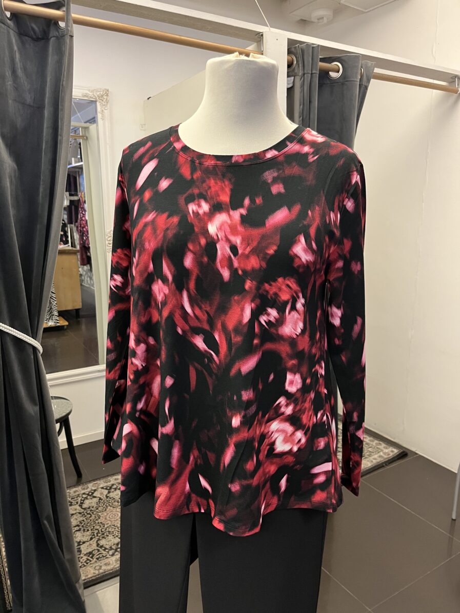 Fin topp från Masai, modellen heter a-shape Regular, rund hals, lång ärm. Mönster i svart/ rött/ rosa 95% viskos 5% elastan