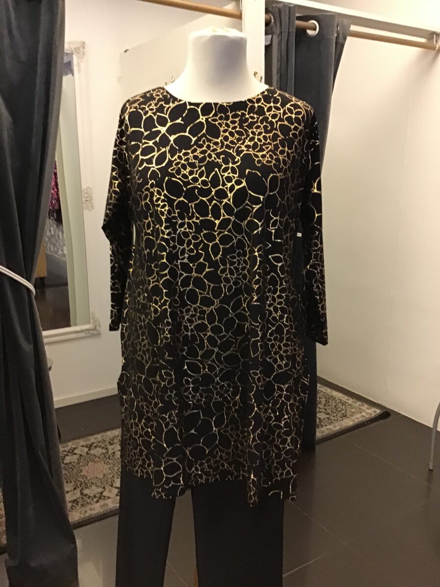 Härlig tunika från Masai, svart botten med guldmönster, a-formad, modellen heter a-shape Regular, ärmen är mellan trekvart och lång ärm. Rund hals, fickor på sidorna. 95% viskos 5% elastan