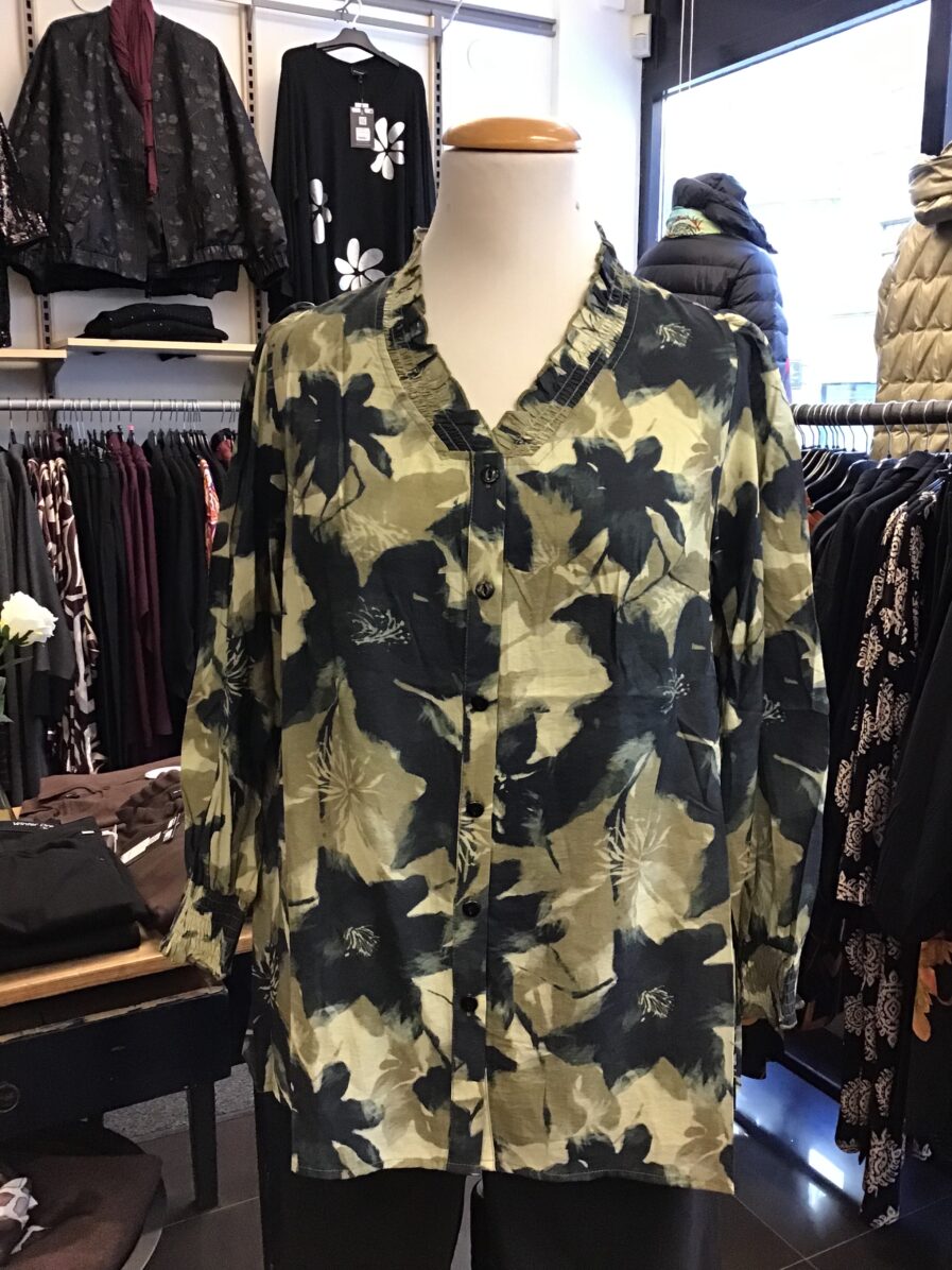 Fin skjorta från danska Studio, v-ringad med resår, knappar hela vägen ner. Lång ärm med resår i mudden. Blommönster i fina höstfärger, gröna nyanser och svart. 85% viskos 15% nylon