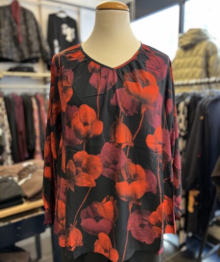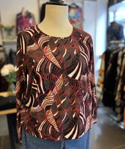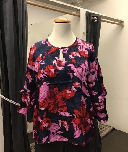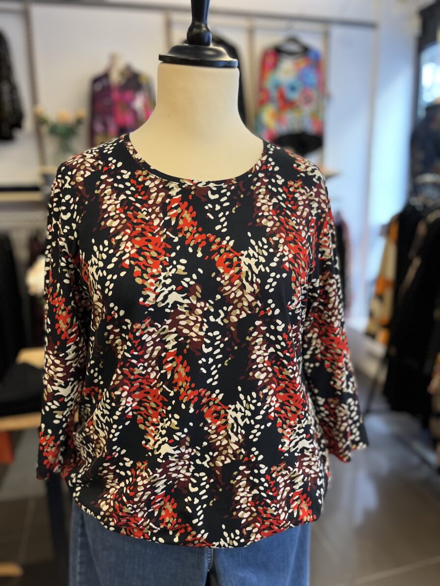 Skön trikå topp från Sunday, en muffins topp, resår nertill. Trekvartsärmar, rund hals. Marin blå botten, mönster i rött/ beige/ offwhite. 95% viskos 5% elastan