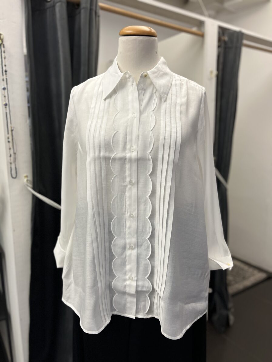 Söt blus från Yest, offwhite, stråveck fram, volangrad längs med knapparna. Lång ärm med bred manschett. 85% viskos 15% polyester . Den är ganska tunn, kanske ett linne under.