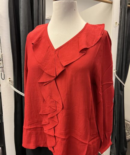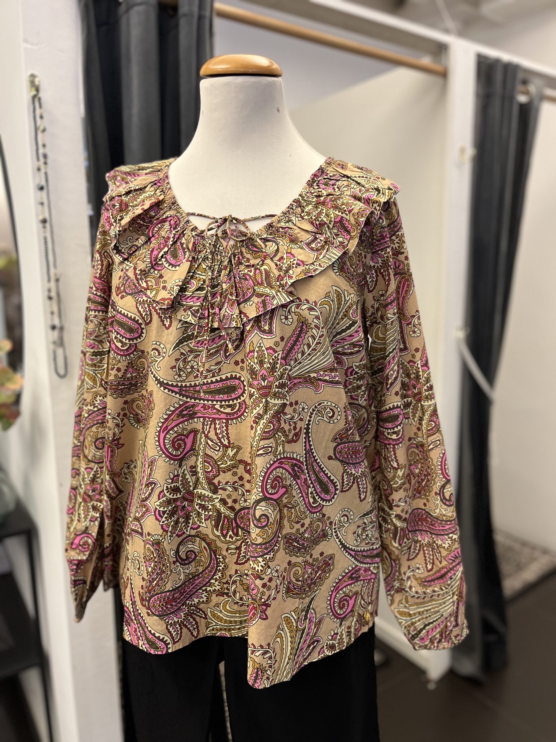 ÄSöt topp från Zoey, v-ringad med volang o knytband, lång ärm med resår nertill. Paisley mönster, botten är beige, sen mönstret i rosa/ ljusgult/brungrönt. 100% bomull